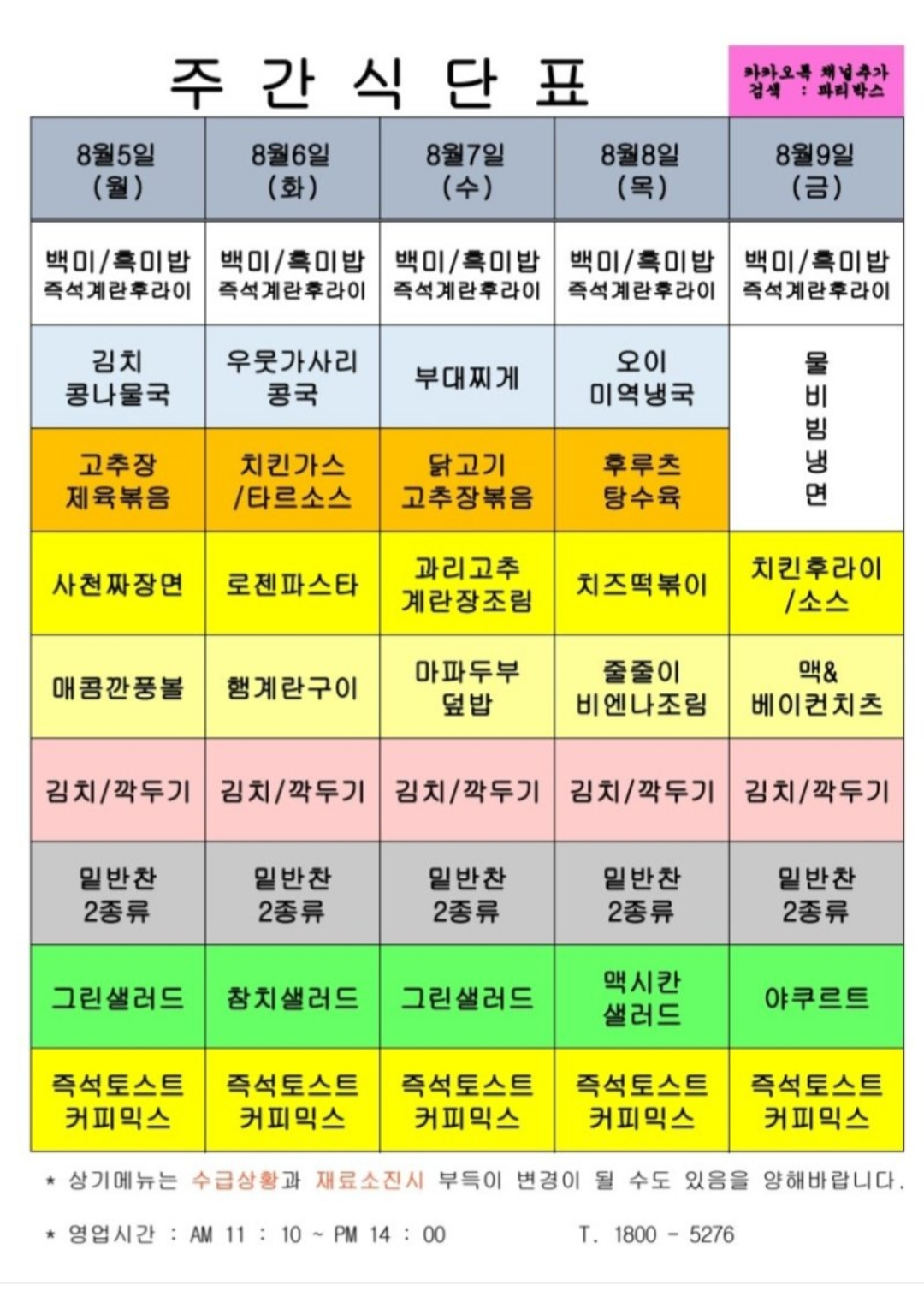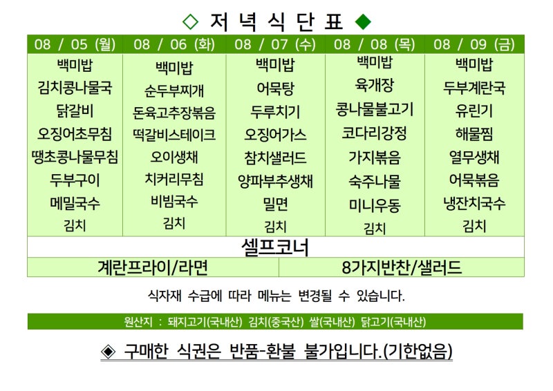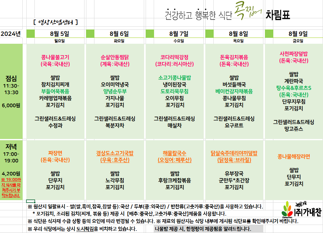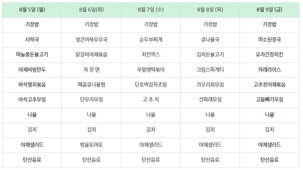 센텀시티 구내식당 식단표 2024년 [8월 5일 - 8월 9일] 주간