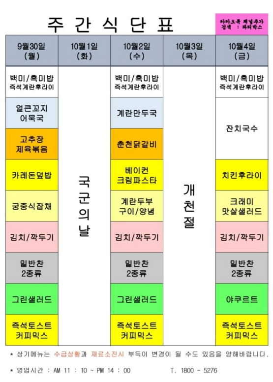 센텀시티 구내식당 식단표 2024년 [9월 30일 - 10월 4일] 주간