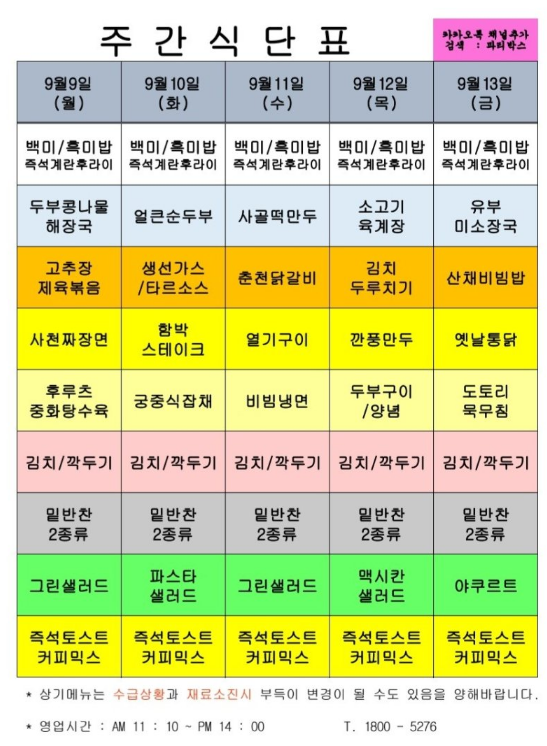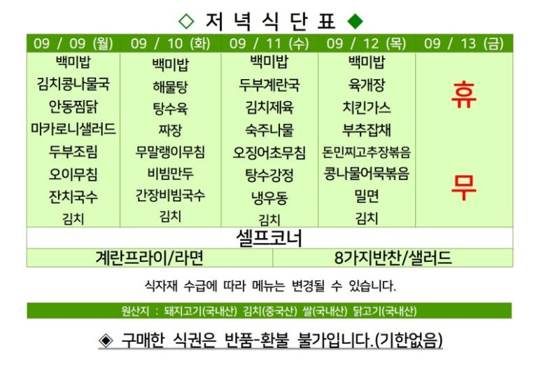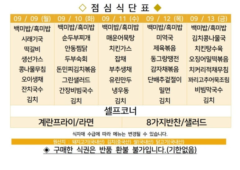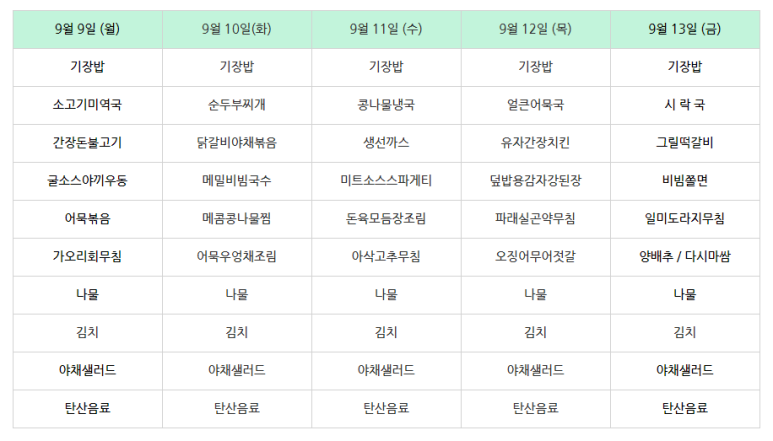 센텀시티 구내식당 식단표 2024년 [9월 9일 - 9월 13일] 주간