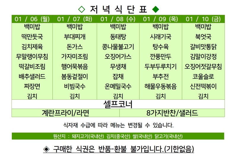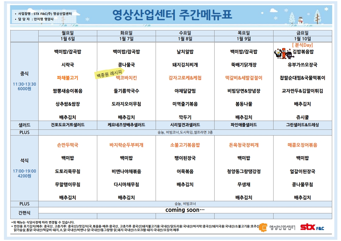 센텀시티 구내식당 식단표 2025년 [1월 6일 - 1월 10일] 주간