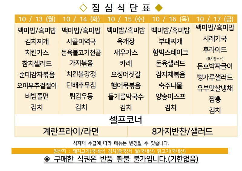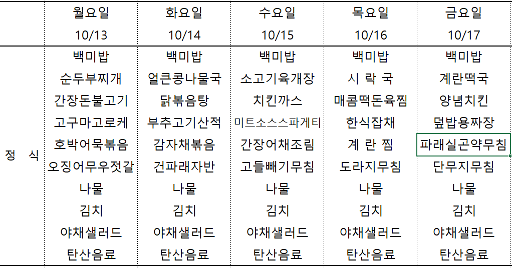 센텀시티 구내식당 식단표 2025년 [10월 13일~17일] 주간