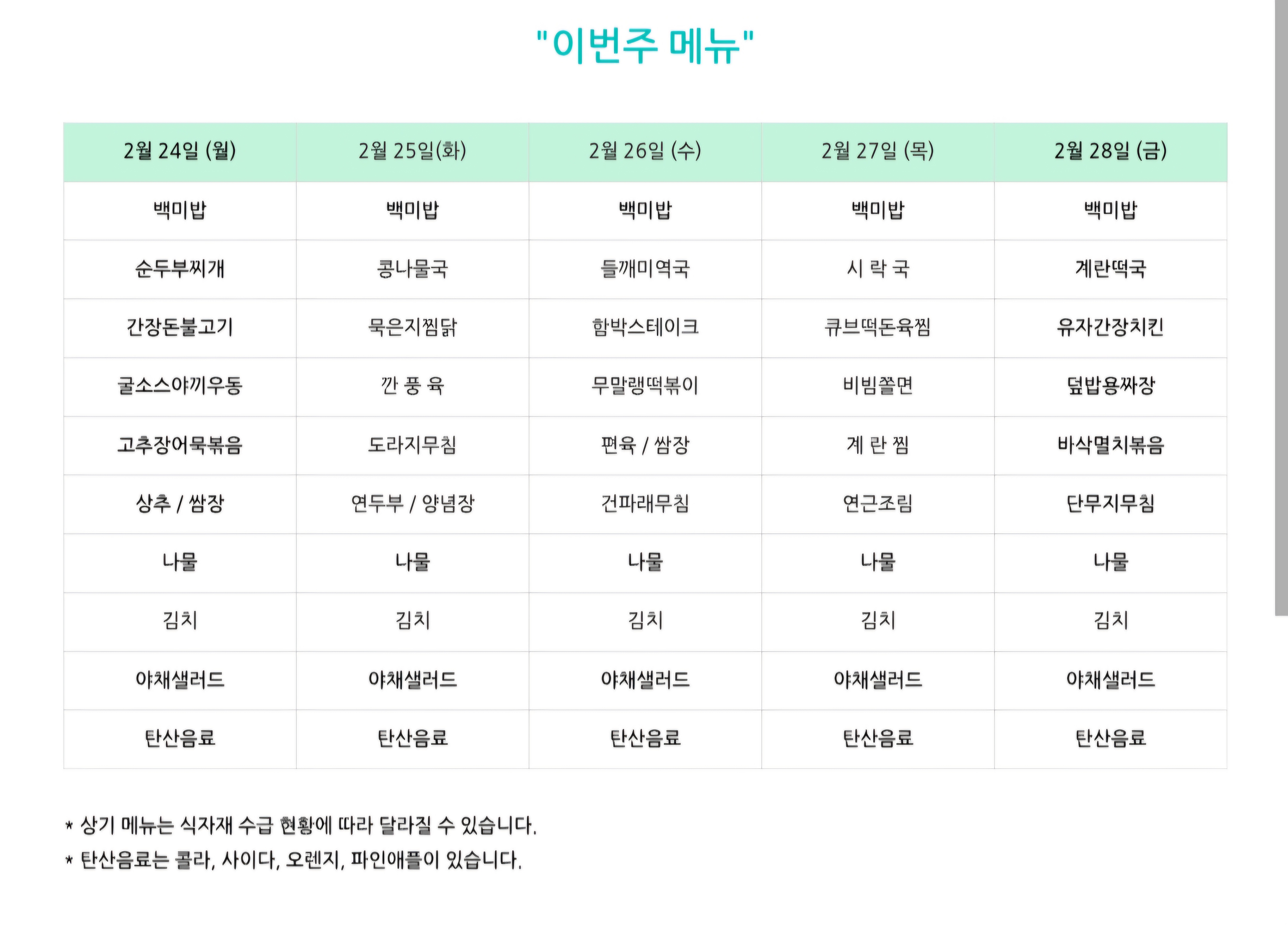 센텀시티 구내식당 식단표 2025년 [2월 24일 - 2월 28일] 주간