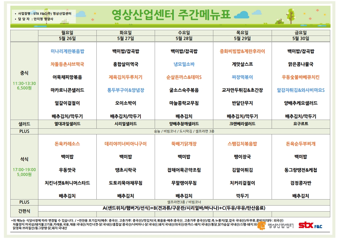 센텀시티 구내식당 식단표 2025년 [5월 26일 - 5월 30일] 주간