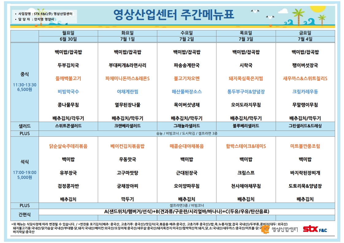 센텀시티 구내식당 식단표 2025년 [6월 30일 - 7월 4일] 주간