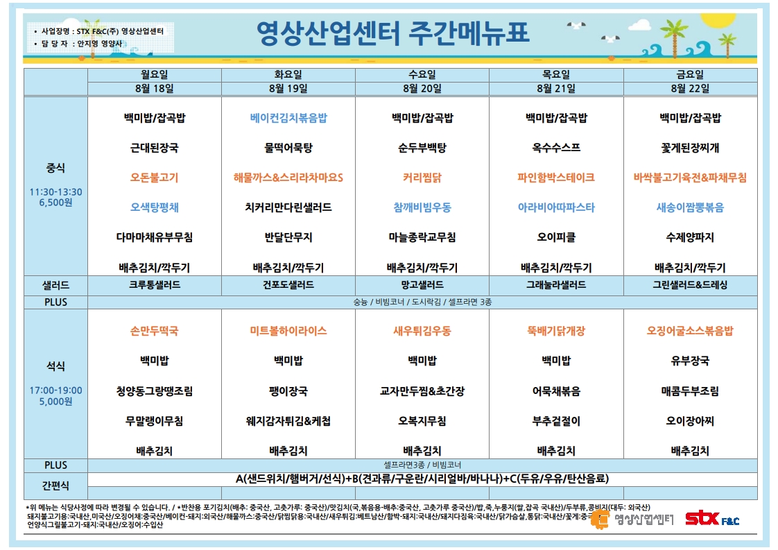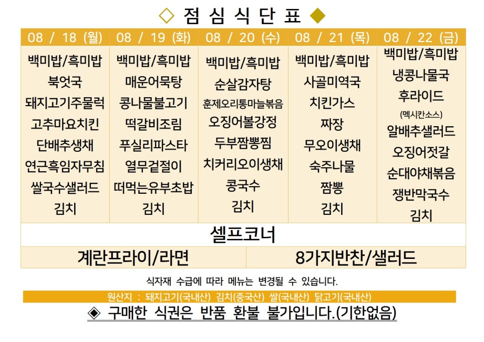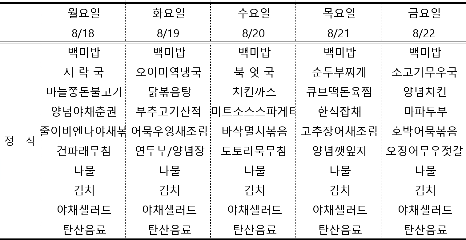 센텀시티 구내식당 식단표 2025년 [8월 18일 - 8월 21일] 주간