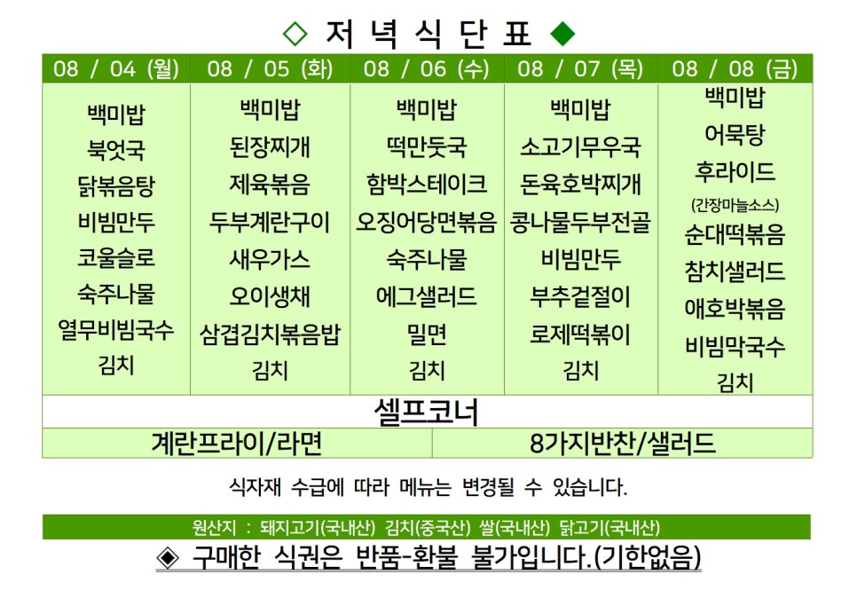 센텀시티 구내식당 식단표 2025년 [8월 4일 - 8월 8일] 주간