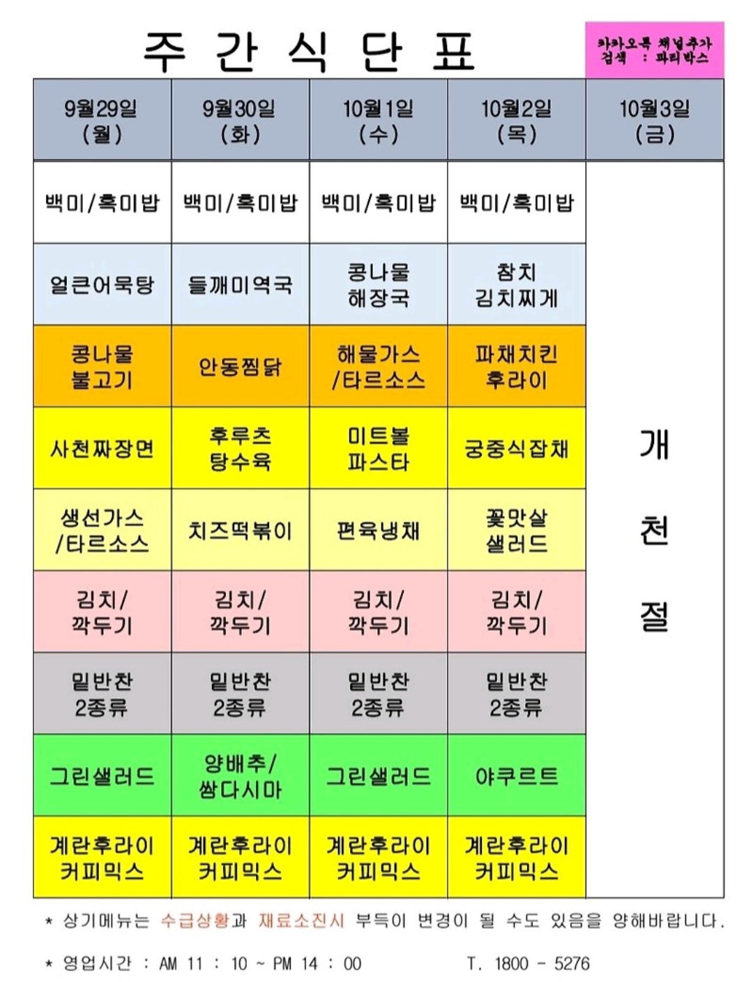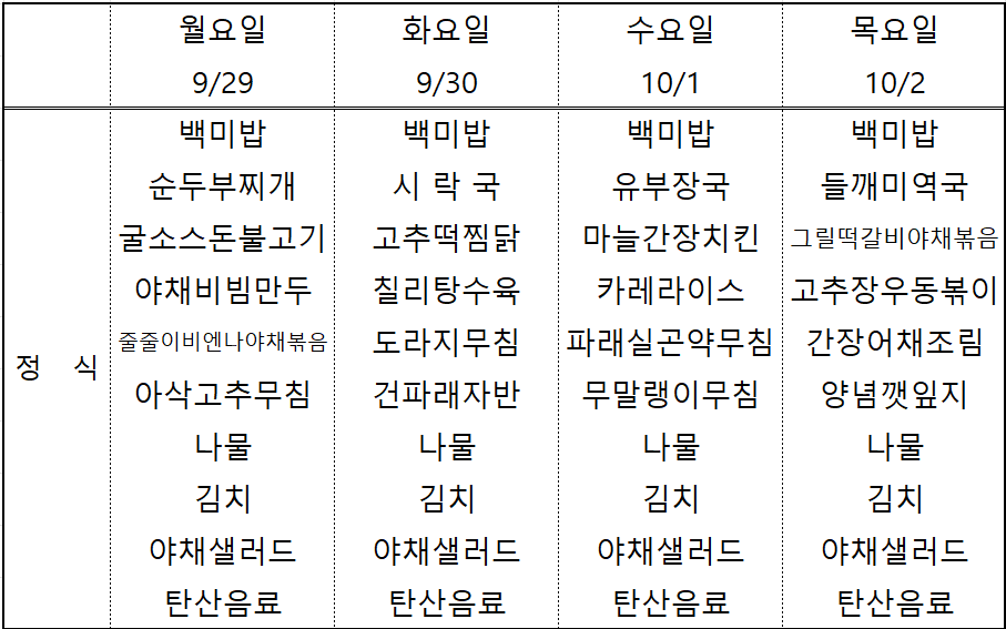 센텀시티 구내식당 식단표 2025년 [9월 29일 - 10월 2일] 주간
