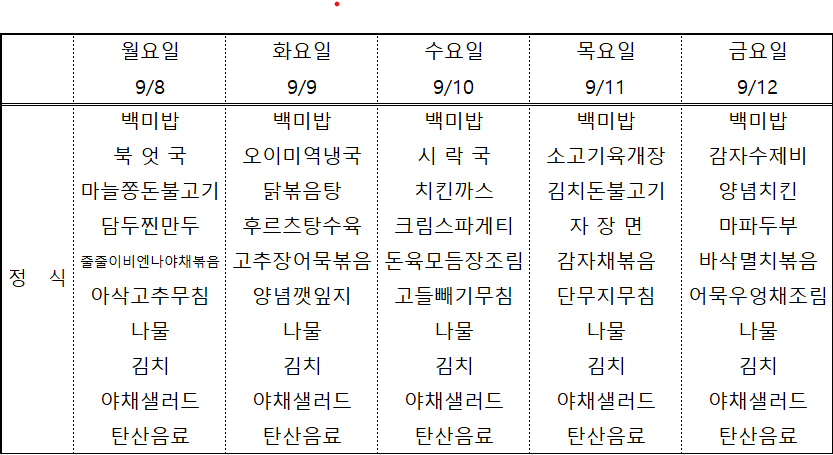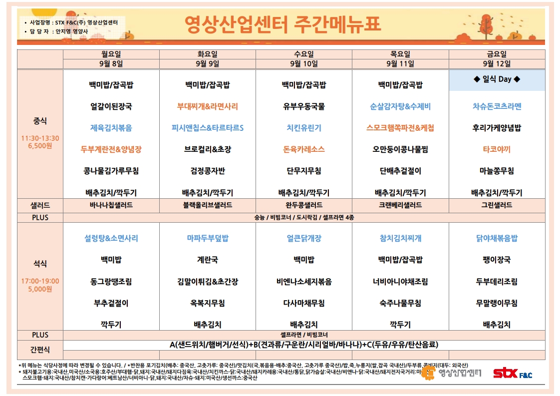 센텀시티 구내식당 식단표 2025년 [9월 8일 - 9월 12일] 주간