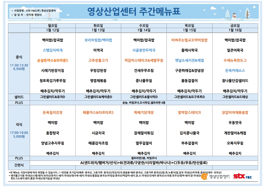 센텀시티 구내식당 식단표 2026년 [1월 12일 - 1월 16일] 주간