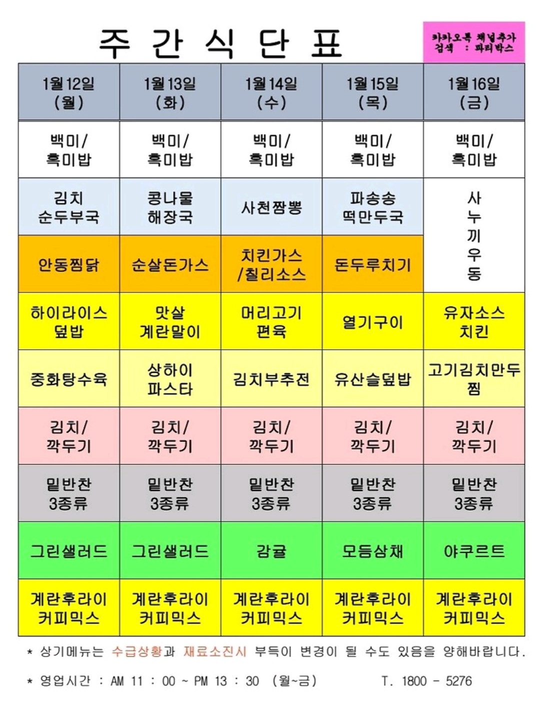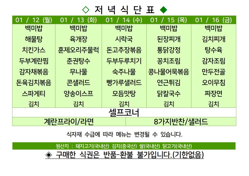 센텀시티 구내식당 식단표 2026년 [1월 12일 - 1월 16일] 주간