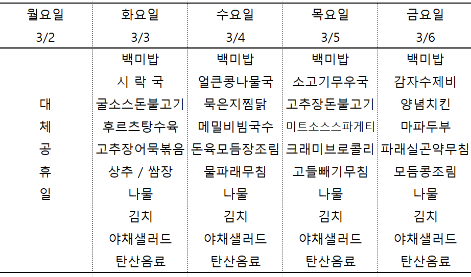 센텀시티 구내식당 식단표 2026년 [3월 3일 - 3월 6일] 주간