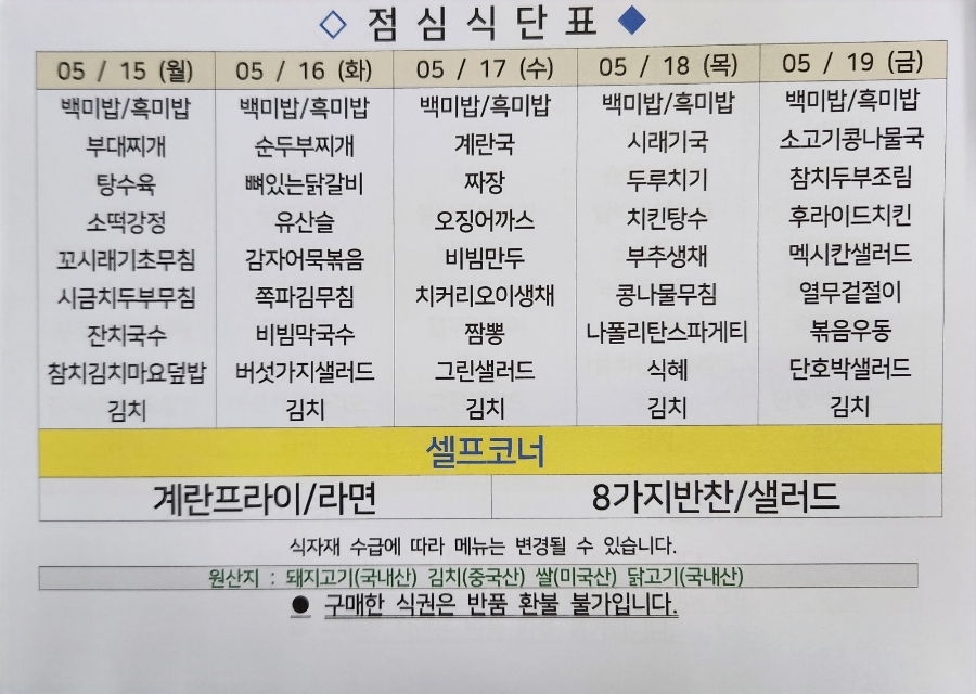 센텀시티 구내식당 식단표 [5월 15일 - 5월 19일] 주간