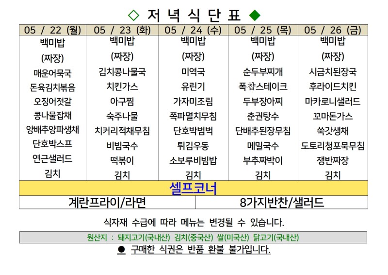 센텀시티 구내식당 식단표 [5월 22일 - 5월 26일] 주간