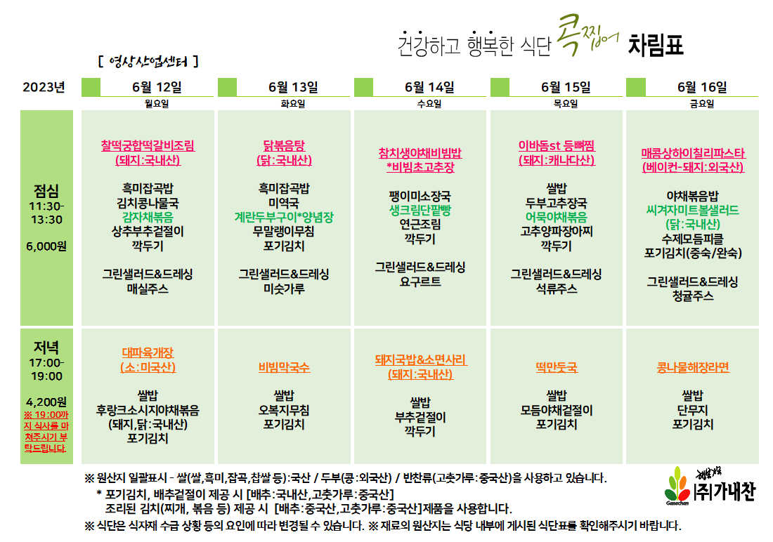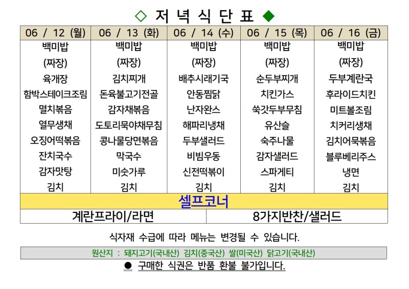 센텀시티 구내식당 식단표 [6월 12일 - 6월 16일] 주간
