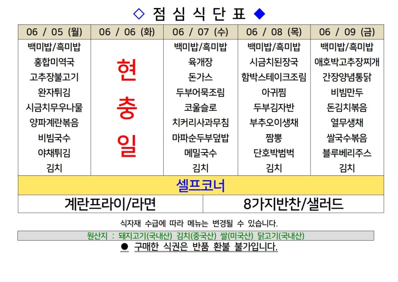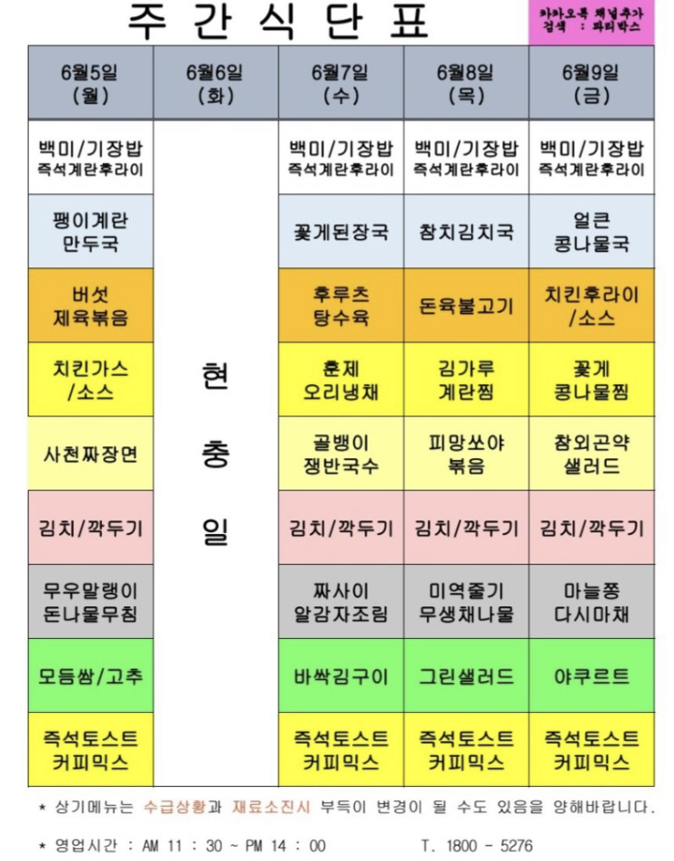 센텀시티 구내식당 식단표 [6월 5일 - 6월 9일] 주간