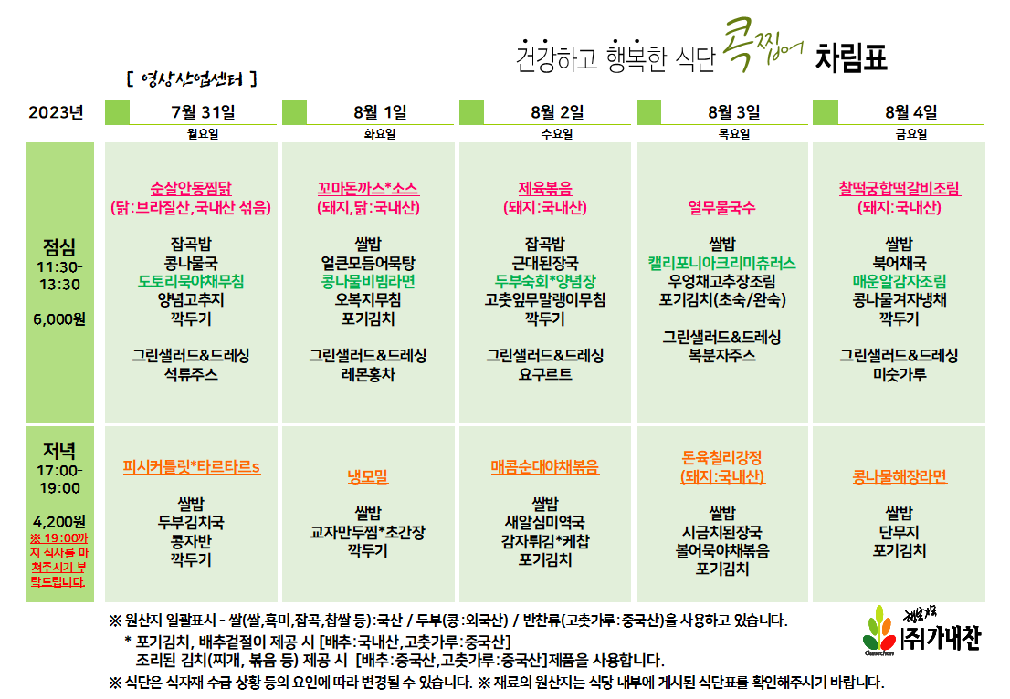 센텀시티 구내식당 식단표 [7월 31일 - 8월 4일] 주간