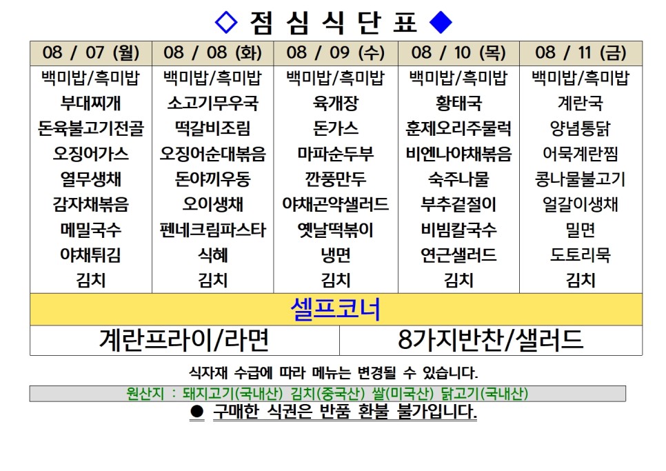 센텀시티 구내식당 식단표 [7월 7일 - 8월 11일] 주간