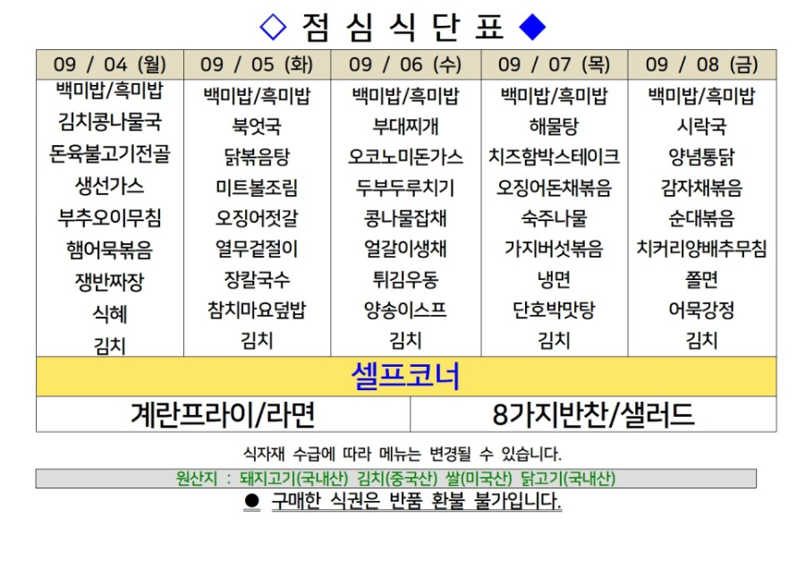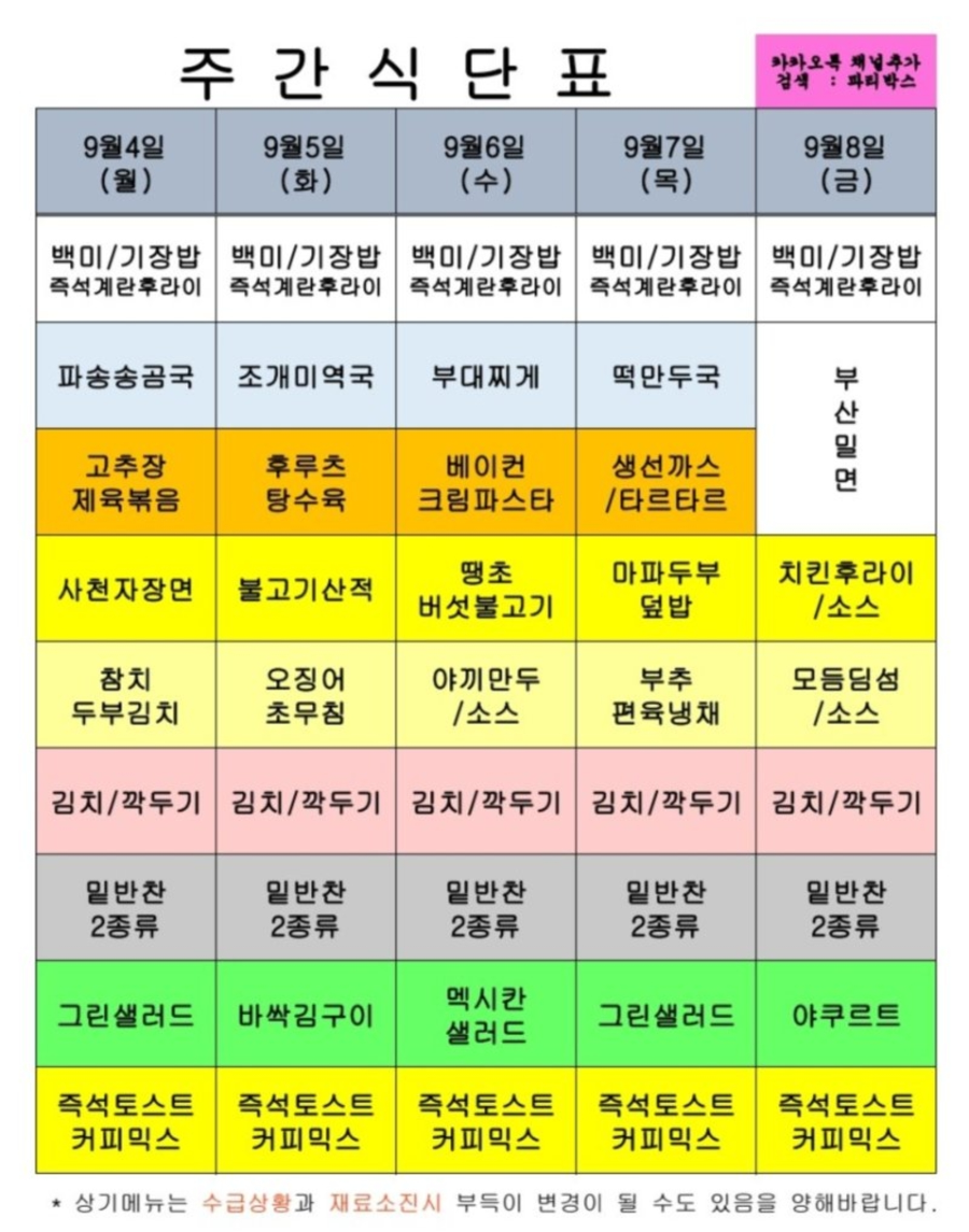 센텀시티 구내식당 식단표 [9월 4일 - 9월 8일] 주간