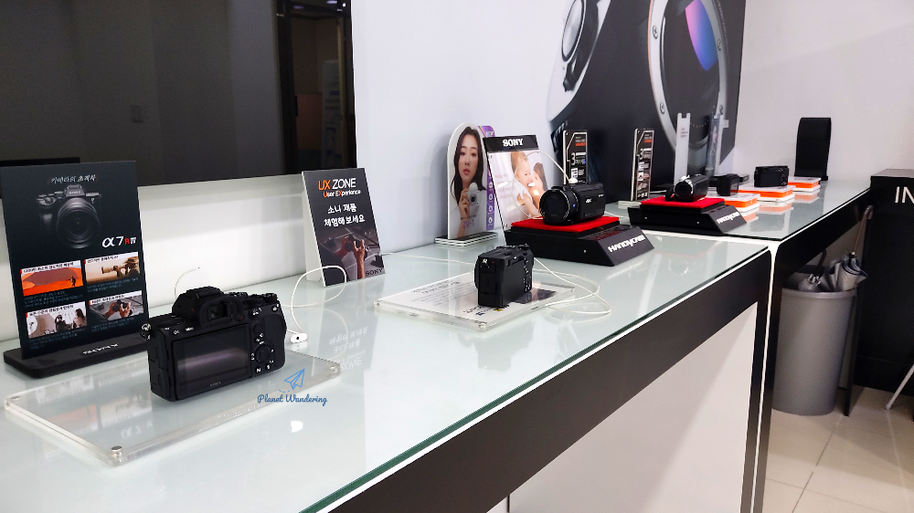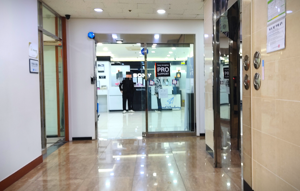 4층에 내리시면 소니서비스센터가 바로 보이고, 번호표를 뽑고 기다리셨다가 접수하시면 됩니다. 접수창구에 늘 직원분이 계시는 건 아니고, 엔지니어 분들이 정비실과 카운터를 오고 가며 접수를 합니다. 소니 카메라 제품들이 전시되어 있는데, 최근 제품들은 아니고 좀 된 듯한 제품들로 보였습니다. 원래 붙어있던 도난방지용 케이블도 떨어져서 따로 놀고 있네요~.