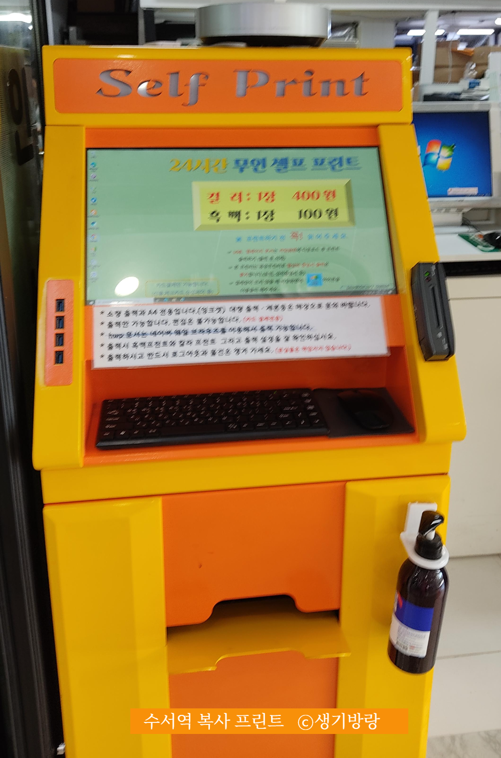 입구 안쪽에 셀프 출력할 수 있는 PC에서 파일을 열고 곧바로 출력을 하실 수도 있고, 직원분께 프린트를 요청하실 수도 있습니다.