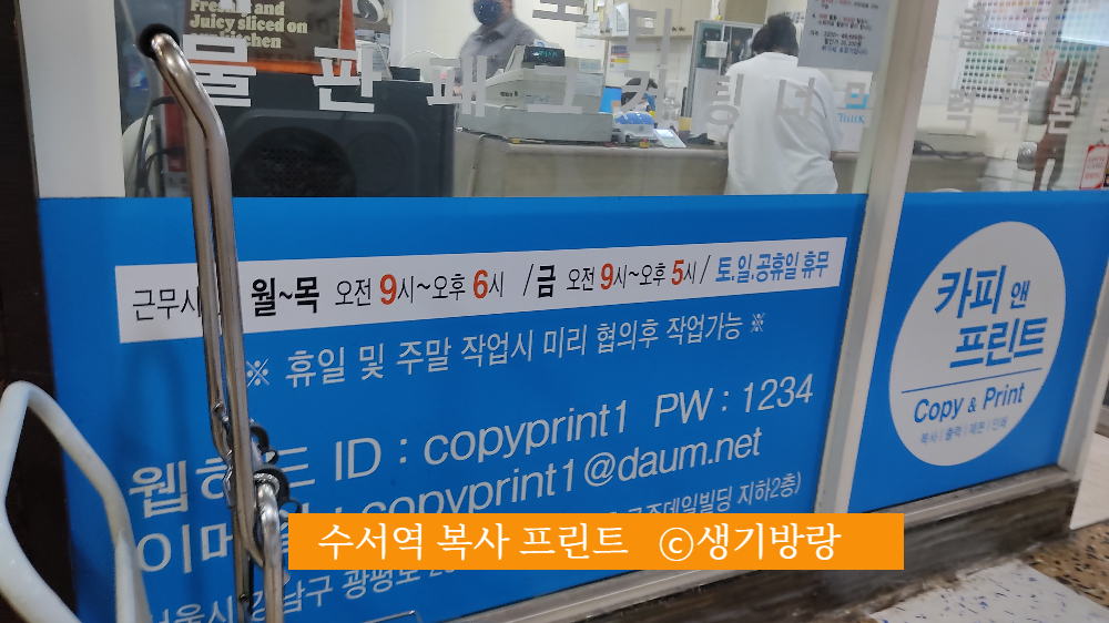 ▷ 위 치 : 로즈데일빌딩 지하 2층 (지하철 3호선 수서역에서 4번 출구로 나가시면 이마트가 있는 건물, 로즈데일빌딩 지하 2층으로 연결됩니다. 전문식당가 표지판을 따라 내부로 들어가시면 알파문구 수서점 옆으로 수서역 복사 '카피 앤 프린트' 가 있습니다.