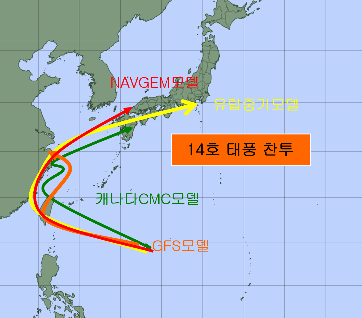아직까지는 우리나라보다는 일본 남부 해안을 따라갈 가능성이 높은 것으로 보이지만 태풍과 주변 기상환경의 변화는 말 그대로 변화무쌍하기 때문에 앞으로의 14호 태풍, 슈퍼태풍 찬투의 행보에 관심을 가져야 겠습니다.