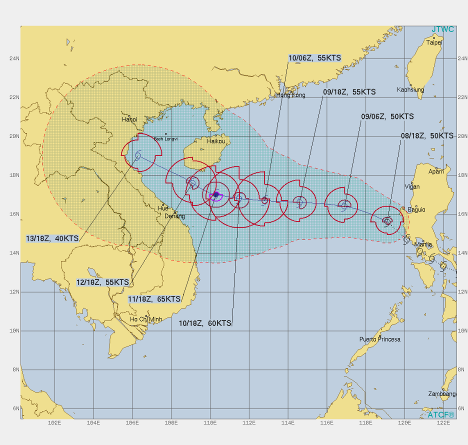 13호 태풍 꼰선은 오늘 오전 필리핀을 떠나 남중국해에 진입했으며 이후 서쪽으로 계속 진행하다 베트남 북부를 향할 것으로 예상됩니다. 필리핀을 지나며 세력이 다소 약화되었지만 태풍 발달에 유리한 조건을 갖춘 남중국해를 지나며 다시 강화되어 9월 12일 새벽에는 최대풍속 초속 33미터 이상의 강풍을 동반할 것으로 예상됩니다.