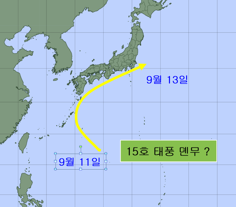 캐나다의 CMC예측모델은 일본 규슈 남단 해역에서 15호 태풍 뎬무가 발생하여 일본 남부 해안을 따라 북동쪽으로 이동할 수 있다는 예측을 내놓았습니다. (9월 9일 예측 기준)