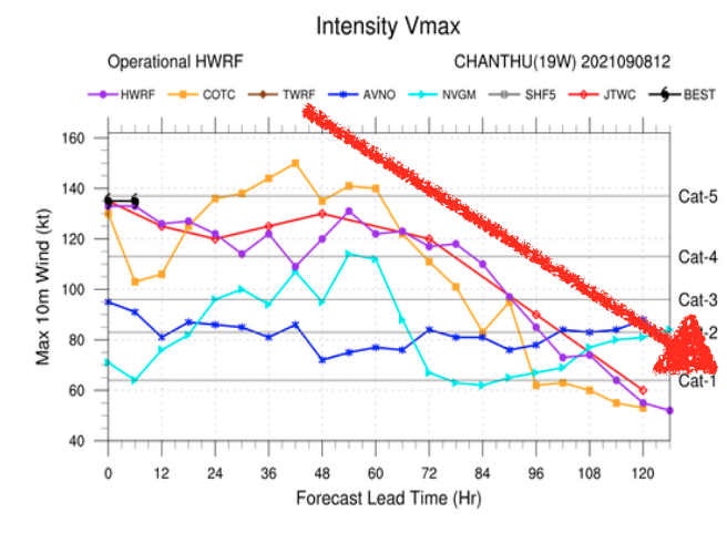 HWRF 사이트가 제공하는 여러 태풍예측모델들의 예측에 따르면 슈퍼태풍 찬투는 사피어 심프슨 허리케인 5단계 중 최고 단계인 5단계에 달할 수도 있으나 약 3일이 경과하는 시점부터는 서서히 그 위력이 약해질 것으로 예상할 수 있습니다.