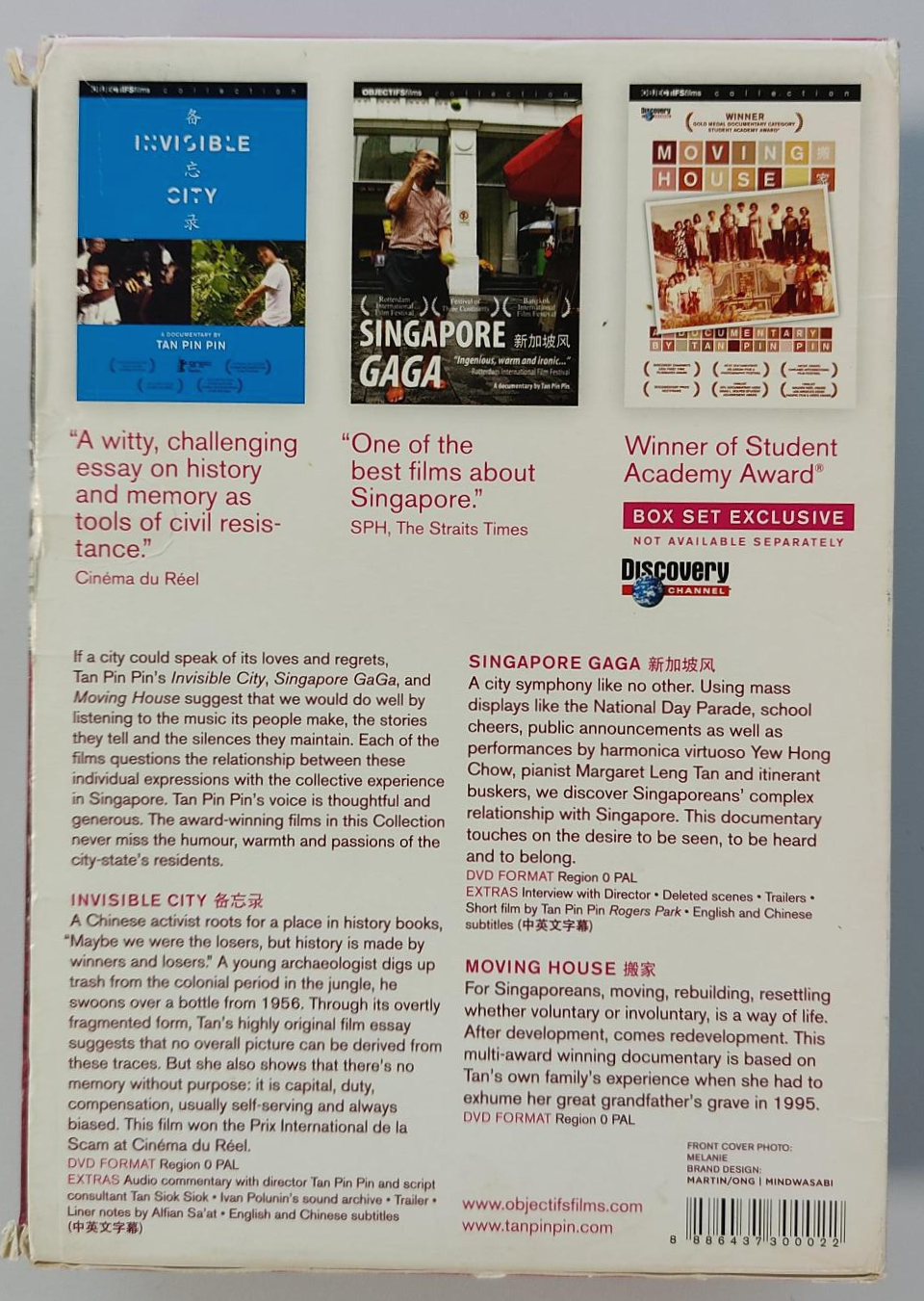 나중에 알고보니 탄핀핀은 싱가포르를 대표하는 독립영화 여류감독이었는데.. DVD 모음집에는 탄핀핀의 대표작으로 꼽히는 싱가포르 가가 (SINGAPORE GAGA), 인비저블 시티 (INVISIBLE CITY), 무빙 하우스 (MOVING HOUSE) 3편이 각각 개별 DVD로 들어있다.