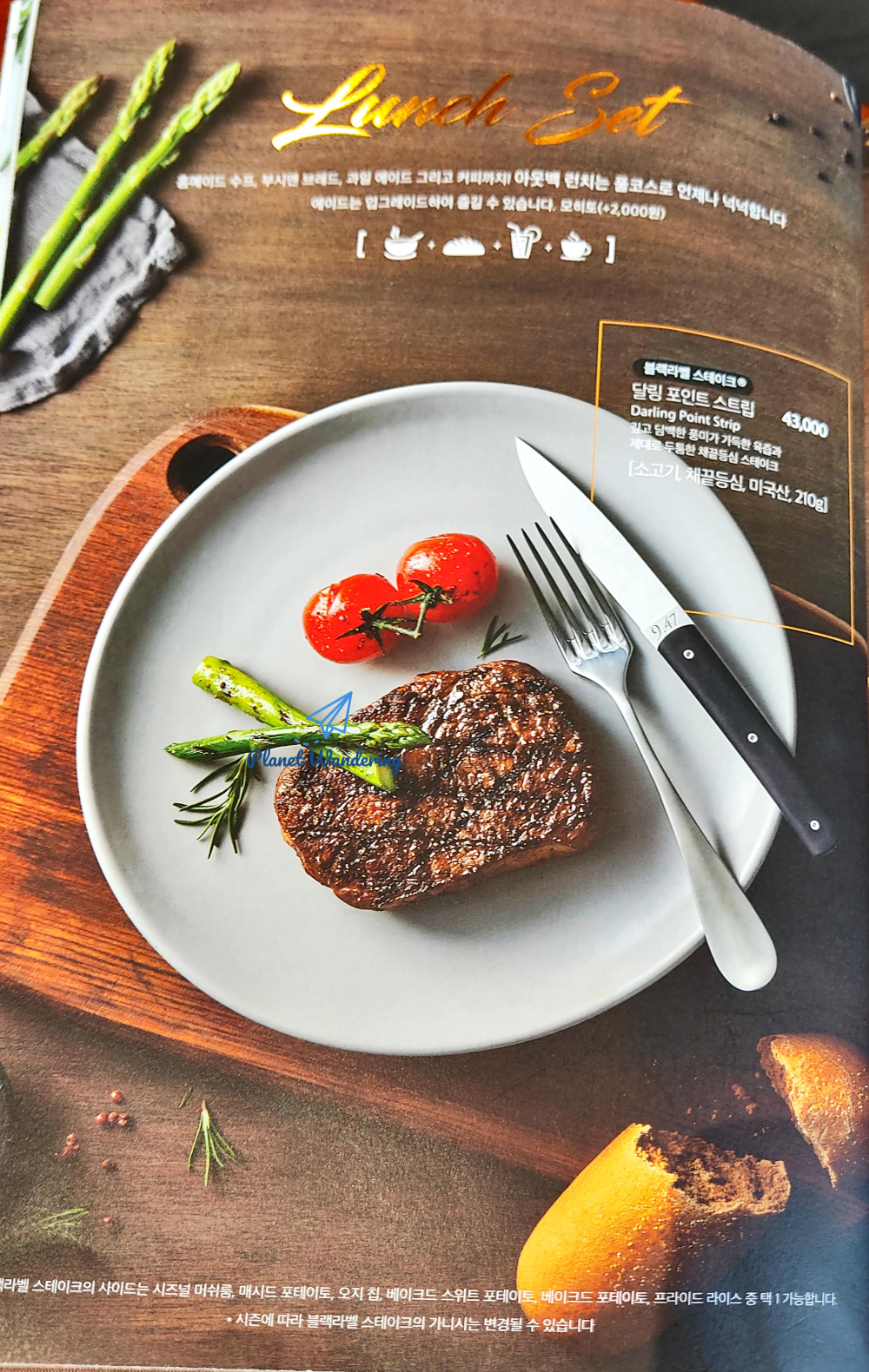 런치세트로 주문 가능한 스테이크는 3종류가 있습니다. 달링 포인트 스트립, 갈립 립아이, 그리고 짐붐바 스테이크입니다. 첫 페이지의 달링 포인트 스트립이 가장 인기가 있다고 하네요. 홈페이지에도 런치세트 가격이 정확하게 나와있어 좋네요. 블랙라벨 스테이크인 달링 포인트 스트립은 43,000원 // 갈릭 립아이는 47,900원 // 짐붐바 스테이크는 38,900원입니다.