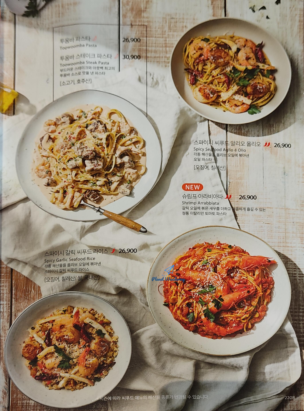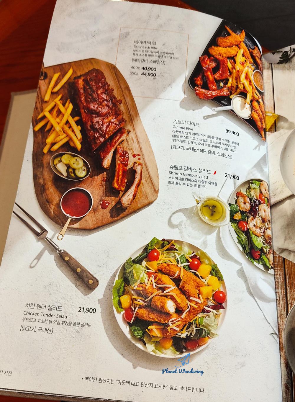 음,, 100그램에 24,000원인데 대략 스테이크가 700~1000그램이라고 합니다. 그렇다면 고기값이 어마어마해질 수도 있겠네요. 오늘 아웃백을 온 컨셉이 런치세트를 먹는 거였으니, 못 본 척 홍보용 메뉴판을 치우고 두툼한 원래 메뉴를 펼쳐봅니다.