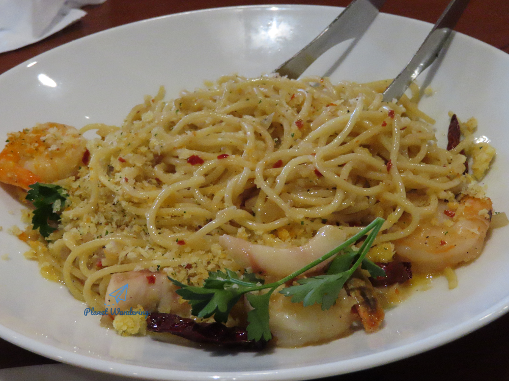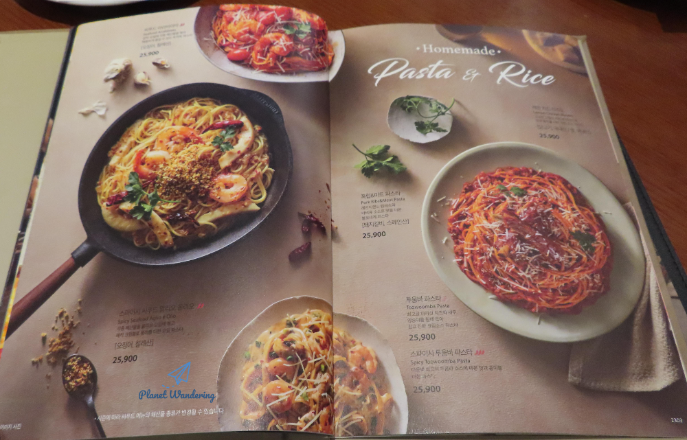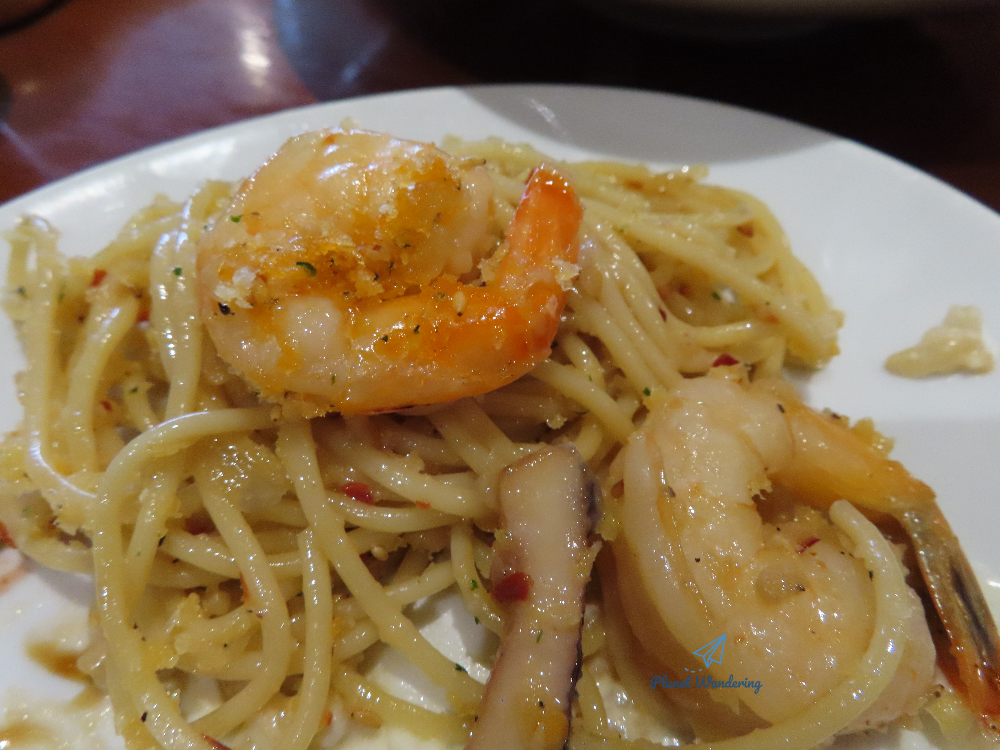 두번째 음식은 파스타입니다. 약간 매운 맛을 내는데 "각종 해산물을 올리브 오일에 볶고 매직 크럼블로 풍미를 더한 오일 파스타"라고 하는군요. 스파게티 면 위로 새우와 오징어, 그리고 매운 고추가 보입니다. 그렇다고 짬뽕 만큼 매운 맛은 아니죠.