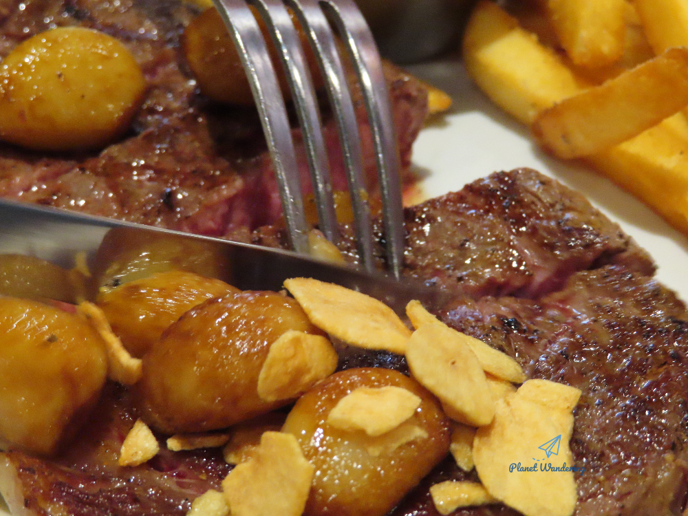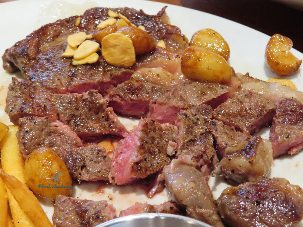 보통의 스테이크들에 비해 고기 위로 구운 마늘과 얇게 썬 마늘 칩이 올라와 있는 게 특징입니다. 스테이크 자체에 마늘향이 느껴지지는 않고, 마늘을 좋아하는 분들이 마늘과 고기를 같이 드시면 좋아할 구성입니다.