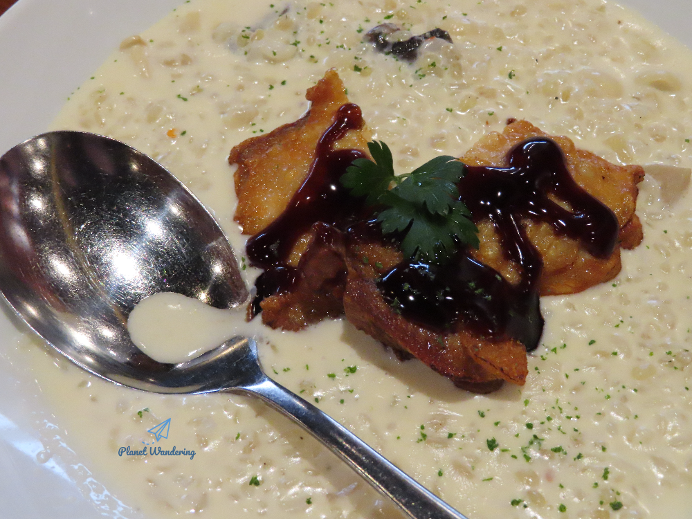 양파 조각과 밥알이 섞여있는데, 크림 소스에 밥 말아먹는 느낌이지만 고소하고 향긋한 크림 소스에 부드러운 밥알과 야채가 좋은 맛을 냅니다. 부드럽고 자극적이지 않아 좋네요. 굳이 레몬즙을 뿌려먹지 않아도 훌륭한 맛을 냅니다.