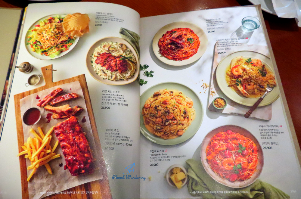 그런데,, 예전보다 런치세트로 주문할 수 있는 스테이크 메뉴가 적어진 것 같네요. 런치세트로 선택 가능한 스테이크는 2가지, 갈릭 립아이와 짐붐바 스테이크입니다. 점심세트 페이지를 한 장 더 넘겨보면 아웃백의 시그니쳐 메뉴로 꼽히는 베이비 백 립과 여러 파스타 종류들도 아웃백 점심특선에 포함되어 있습니다.
