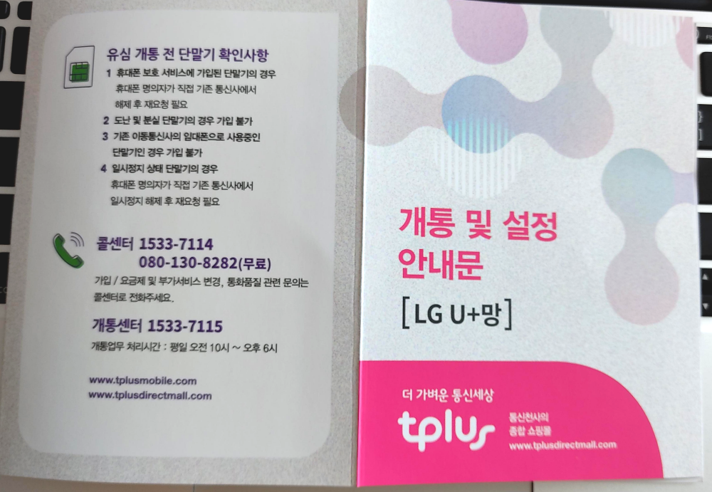 유심카드 안내문 안에는 유심칩과 여러 설명들이 적혀있지만 핸드폰 상에서 홈페이지를 열어 그대로 따라 하면 안내문의 내용 없이도 개통이 가능합니다.