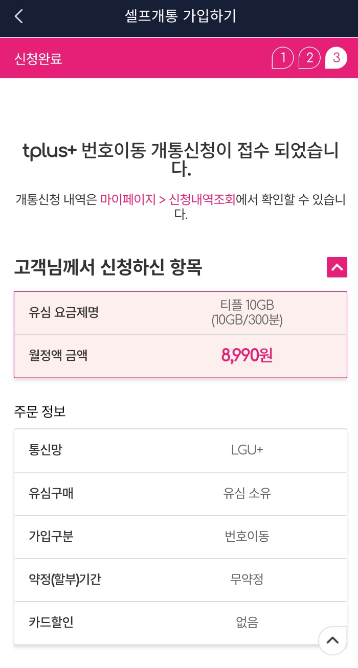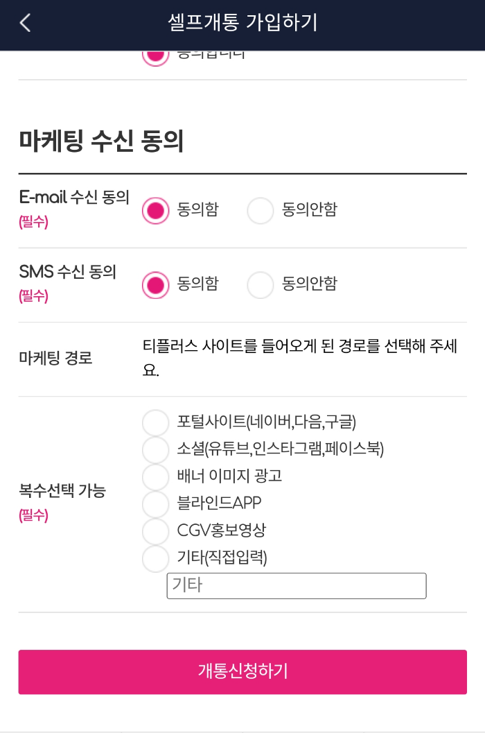 요금납부 정보와 마케팅 수신 동의/동의안함 을 선택하면 절차 완료