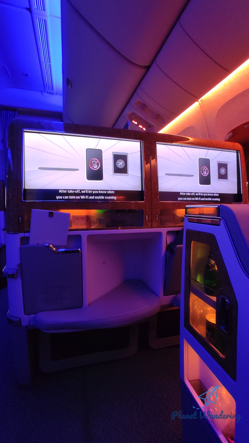 에미레이트항공 보잉 777-800의 비즈니스 클래스 좌석입니다. 이날 탄 비행기는 퍼스트 클래스가 있는 비행기로 비즈니스 클래스와 이코노미 클래스만 있는 비행기와는 좌석 배치가 조금 다릅니다. 창문도 우드 그레인으로 멋을 내고 대형 모니터 주변도 우드 그레인 처리를 했습니다.