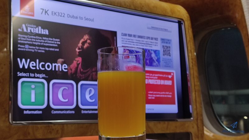 두바이 시각으로 새벽 3시 경 비행기가 출발하기 때문에 기내식은 아침식사와 점심식사 2회가 제공됩니다. 샴페인이나 칵테일을 좋아하는 분들은 관심 가는 것들이 많겠지만 주스와 탄산음료 사이에서만 고민을 하는 방랑객은 별 다른 호기심이 생기지 않네요.
