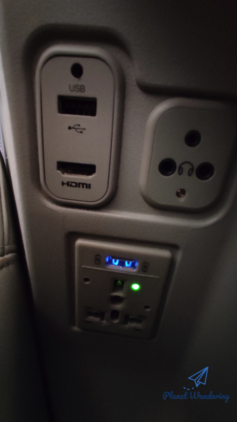 좌석은 가죽 시트이고 이코노미석보다 더 두툼한 담요라기보다는 이불이 준비되어 있네요. 배게도 부직포 커버 대신 면 커버이고 훨씬 크고 폭신폭신합니다. 모니터 밑 선반은 키가 큰 승객에게는 발받침이 되겠지만 방랑객처럼 키가 작은 승객에게는 물건을 얹는 선반이 되네요.