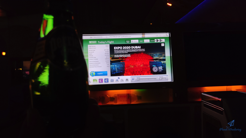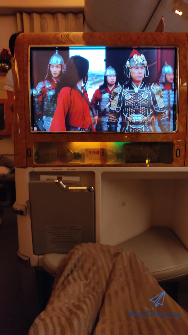 발 끝까지 덮고도 남을 포근한 이불을 휘어 감고 좌석을 길게 펼쳐 누워있습니다. 에미레이트항공 비즈니스 클래스 좌석의 모니터 밑으로는 투명한 서랍장이 있습니다. 이 안에는 에비앙 생수가 2병 들어있고 안대와 기내 양말이 들어있습니다. 방랑객은 이코노미 좌석에서도 안대나 기내 양말을 사용하지 않기 때문에 서랍장 안에 있는 안대와 기내 양말도 그냥 내버려 두었습니다. 물론 비행기에서 내릴 때에는 블로그에 쓸 사진도 찍어야 하기 때문에 당연히 챙겨서 내렸죠. 당장 마실 것도 아니지만 에비앙 생수도 모두 들고 내렸습니다.
