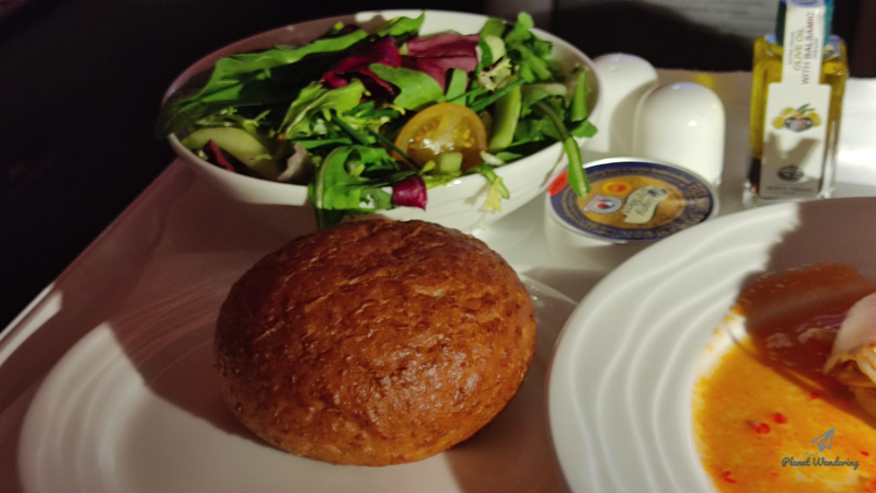 비즈니스 클래스 기내식과 이코노미 클래스 기내식의 차이는 여러가지가 있지만 식기류와 식탁보가 가장 큰 차이로 느껴집니다. 격식을 갖춘다고 할까요? 식판을 펼치면 하얀 면 소재의 테이블보를 먼저 깔죠. 그리고 모든 그릇은 도자기 그릇입니다. 원양어선에서는 선장님만 도자기 그릇에 밥을 먹는데 (나머지 사관 선원들은 스테인리스 그릇) 비즈니스석도 그런 예우를 해주는 거겠죠.