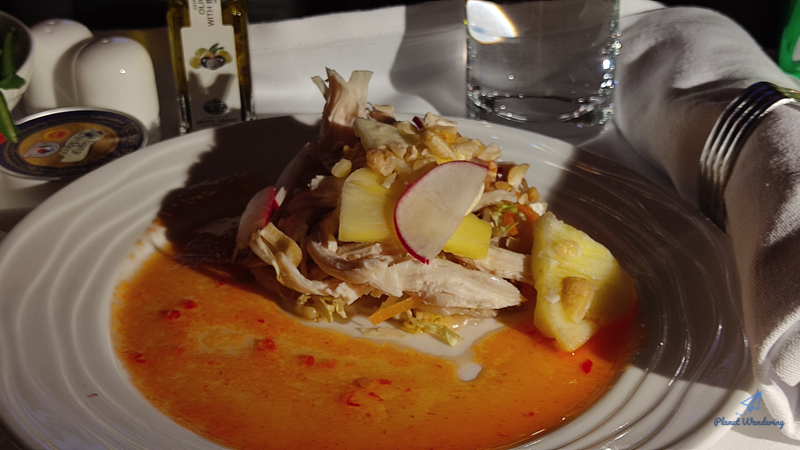 애피타이저입니다. 비몽사몽 간에 먹던 너트는 살짝 옆으로 치우고, 테이블보를 깐 커다란 쟁반에 샐러드와 애피타이저가 먼저 나왔습니다. 치킨 샐러드입니다.