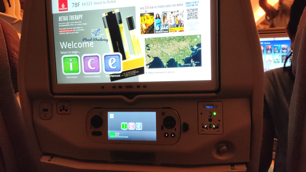 에미레이트항공의 장점 중 하나로 기내 엔터테인먼트 시스템을 꼽을 수 있습니다. 에미레이트항공의 엔터테인먼트 시스템 이름은 아이스 ICE입니다. 정보, 소통, 오락을 묶었다는 얘기인데, 실제로는 [ i ]를 눌러 비행기 내비게이션과 기체 외부에 달린 카메라로 바깥을 보는 정도 쓰고, [ e ]를 눌러 영화나 드라마를 보죠. 에미레이트 항공의 영화 라이브러리는 대단합니다. 최신 신작에 가까운 영화들로부터 고전 명작에 에미레이트가 취항하는 각 나라 영화들도 많이 준비되어 있죠. 예전에는 블록버스터 영화들이 많았다면, 최근에는 각 국가 별 영화가 많이 보강되었다는 느낌입니다.