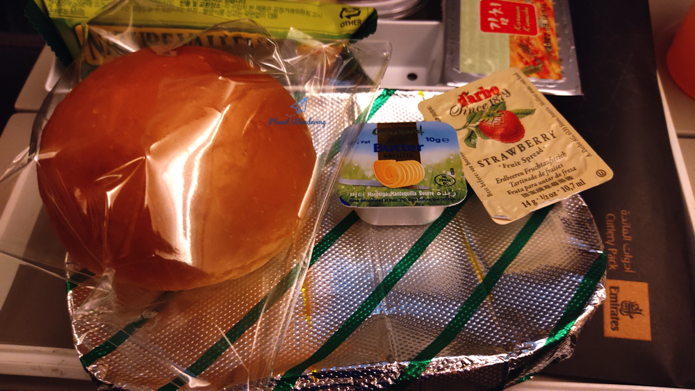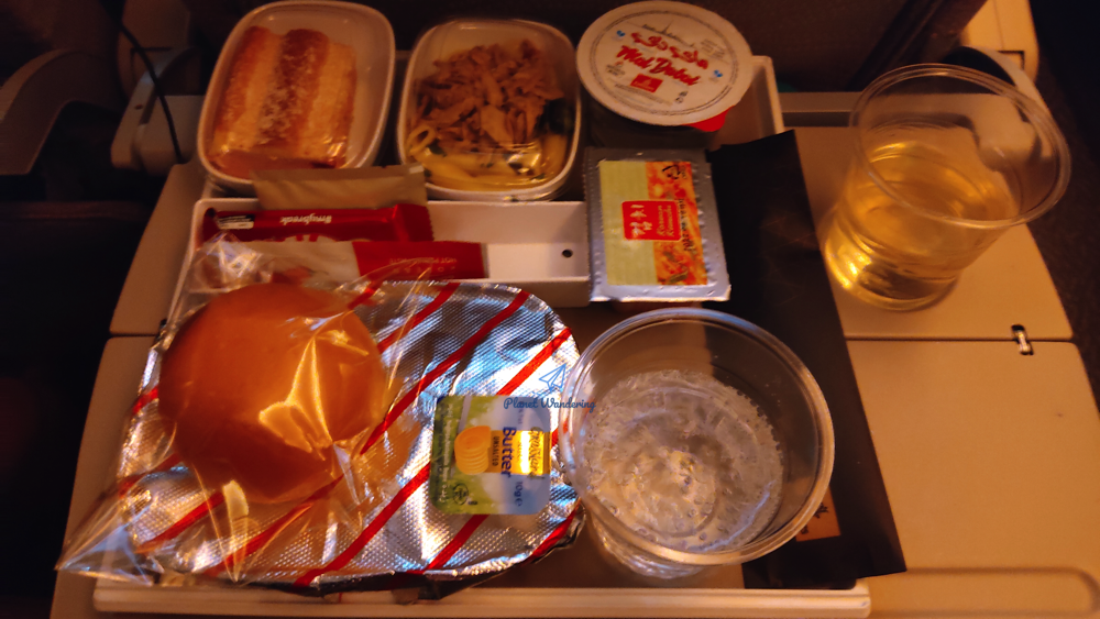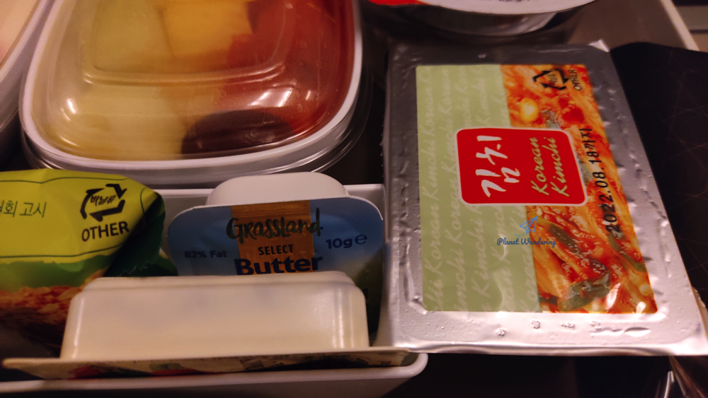 메뉴에 안내된 구성 그대로입니다. 알미늄 포일에 싸인 메인 메뉴, 빵, 김치, 애피타이저와 디저트가 있고, 100밀리리터 컵 용기에 담긴 생수도 나왔습니다. 가운데 작은 플라스틱 바구니에는 버터와 물티슈, 고추장, 키커 초콜릿이 담겨있습니다. 식판 위쪽으로 거뭇하게 보이는 건 스푼, 포크, 나이프가 들어있는 비닐봉지인데 이 안에 냅킨 한 장과 후추, 소금이 함께 들어있죠. 작년 가을까지만 해도 고추장은 작은 튜브 고추장이 나왔는데 이제는 맥도널드 케첩만 한 크기로 나오네요.