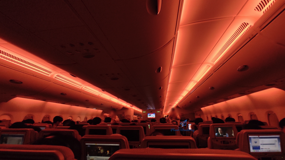 시간 차를 두고 조명이 점점 밝아집니다. 아마 심야에서 새벽, 여명, 일출로 향하는 분위기를 앰비언스 라이트로 연출하는 것 같네요. 해가 떴으니 다시 밥을 먹을 시간입니다. 취침시간에 자취를 감췄던 승무원들이 다시 분주하게 오가기 시작합니다. 자세히 살펴보면, 비행기 출발 때의 단정하고 예쁘게 꾸몄던 모습에서는 피곤이 지쳐 살짝 흐트러진 모습을 엿볼 수 있죠. 승무원 업무가 많이 고되겠지요.