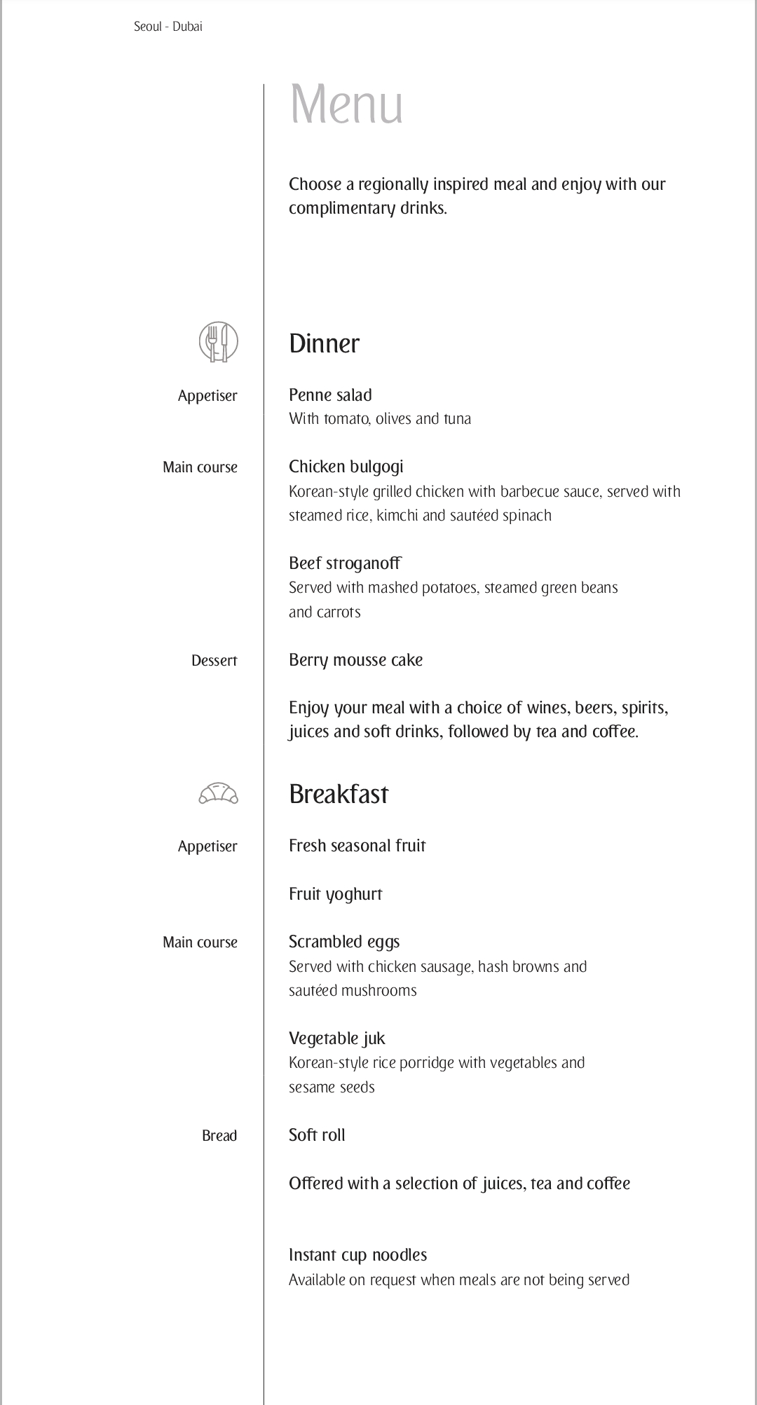 두바이 도착 약 2시간 전, 아침식사가 제공됩니다