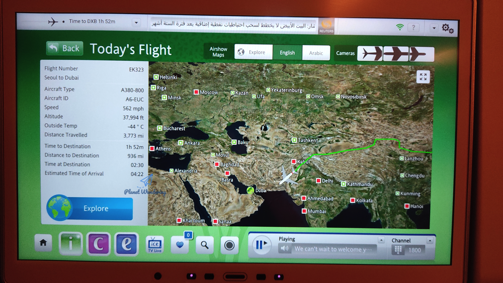 모니터를 켜서 비행기가 어디까지 왔는지를 살펴봅니다. 대충 7시간을 날아왔고 2시간 후면 두바이에 도착을 하겠네요. 한국은 대략 이른 아침이고, 5시간 늦은 두바이는 심야겠네요. 이제 아침밥을 먹고 조금만 버티면 두바이에 착륙을 하게 됩니다. 깊은 잠에 빠져있던 승객들도 대부분 눈을 떴습니다.