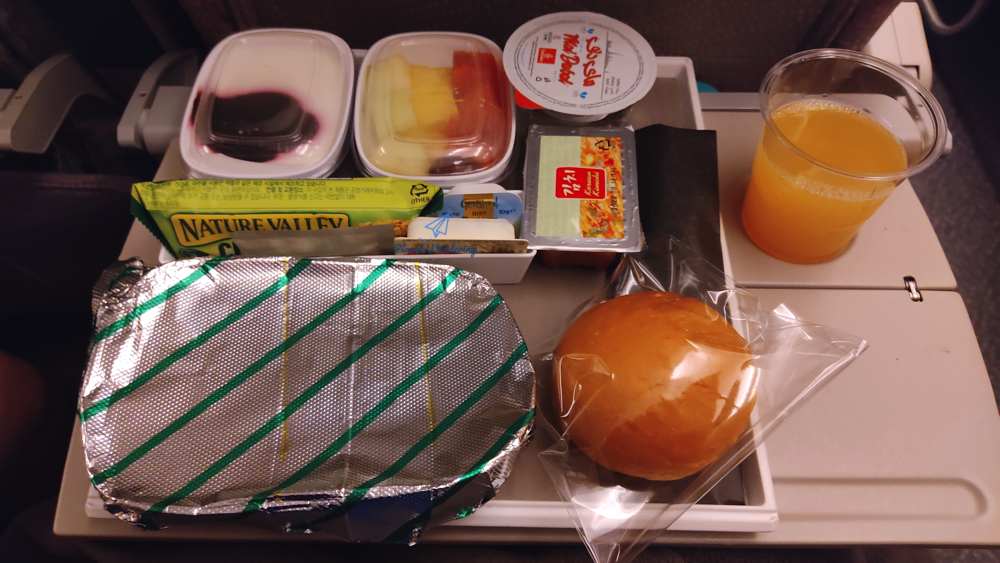 아침밥은 스크램블 에그 또는 야채죽입니다. 아침밥은 몇 년간 바뀌지 않고 거의 그대로인 듯 합니다. 방랑객은 2018년부터 최근까지 8번 이 비행기를 탔는데요, 둘 다 먹어본 느낌으로는 죽이 더 좋네요. 그래서 이번에도 죽을 선택 했습니다. 아침 기내식은 저녁 기내식보다 살짝 가벼운 느낌입니다. 과일과 요거트, 김치, 빵은 다 똑같고 죽 그릇, 또는 스크램블 에그만 다른 구성이죠. 음료는 탄산음료 대신 주스 종류를 권합니다.